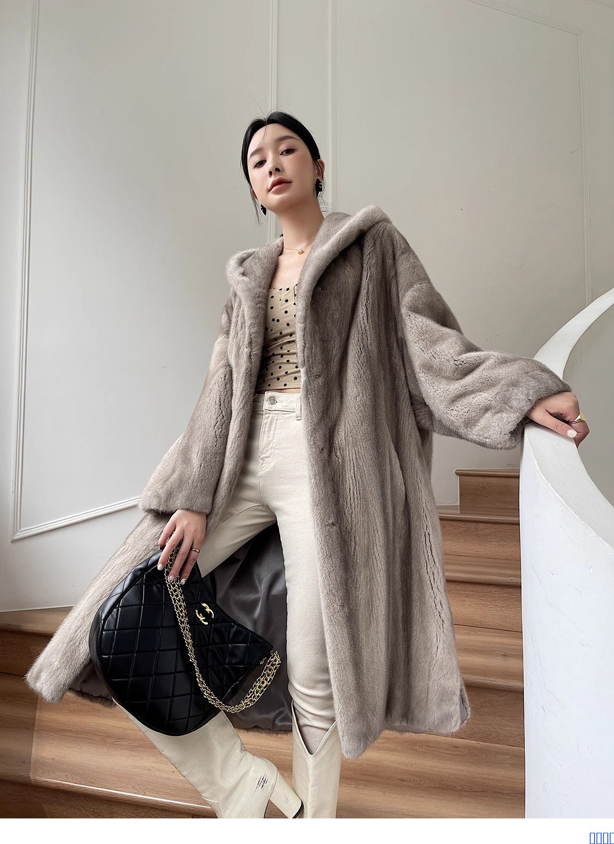 新款进口紫标天鹅绒长款过膝貂皮大衣连帽水貂皮草外套女