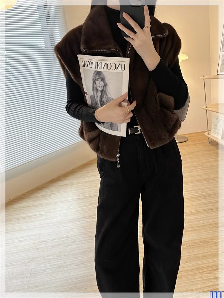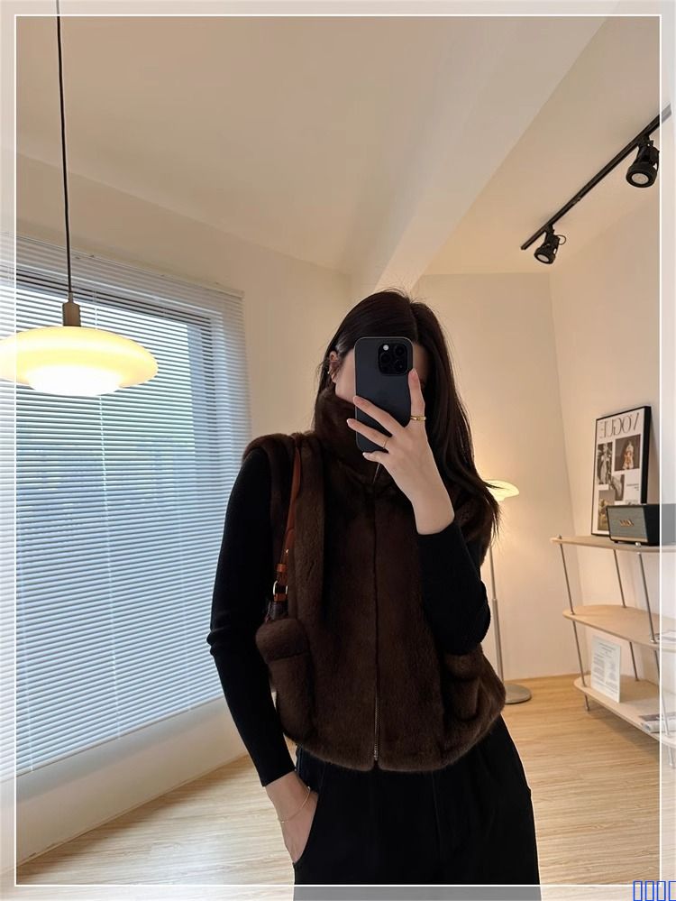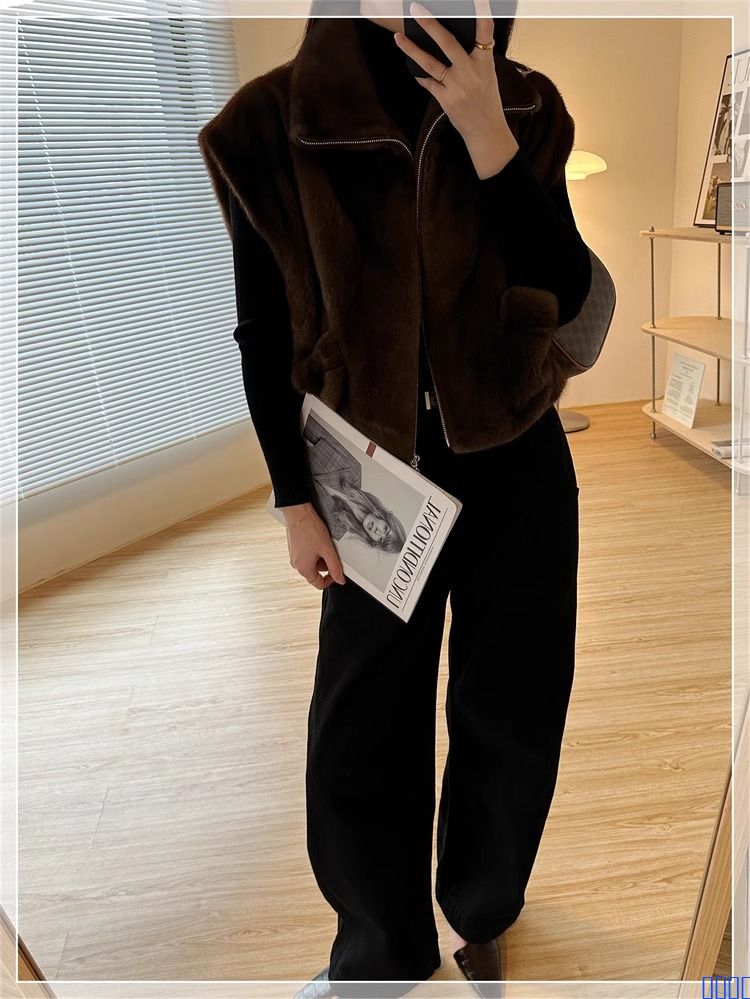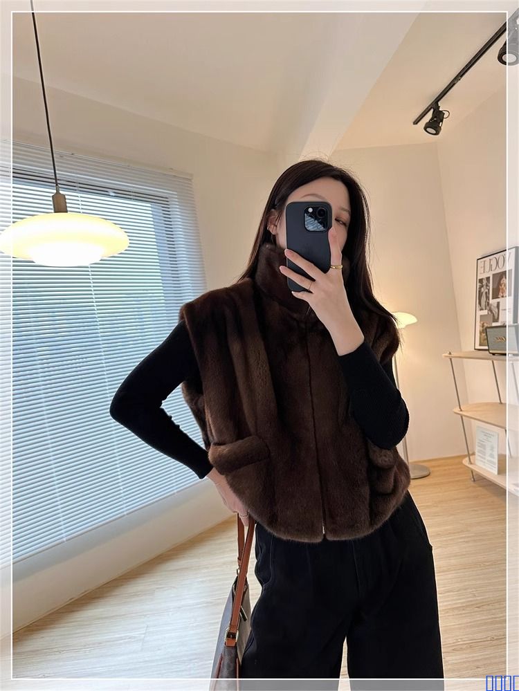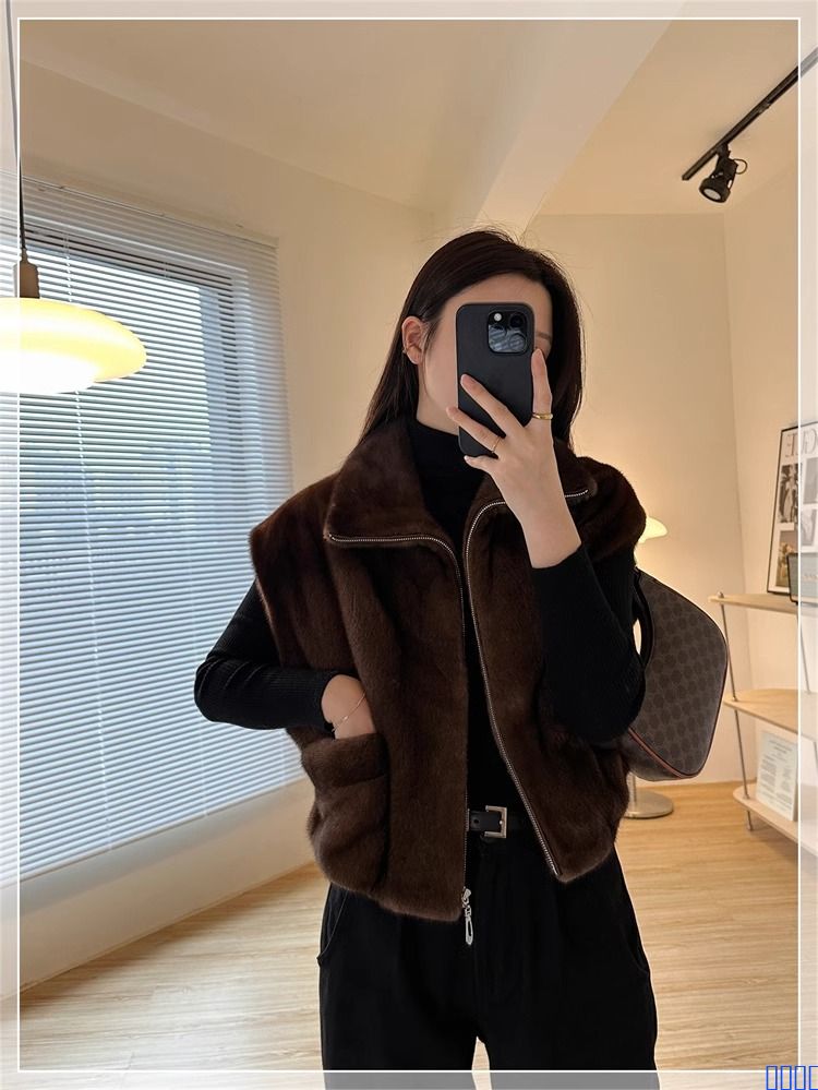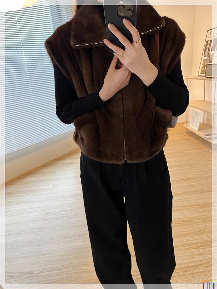 新款进口水貂毛皮草天鹅绒咖啡貂整貂休闲年轻貂皮背心马甲外套女