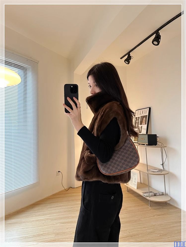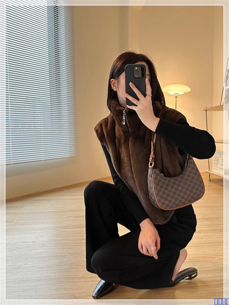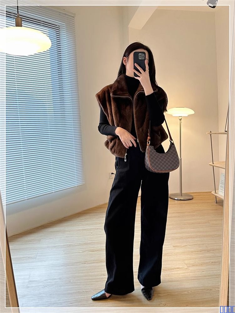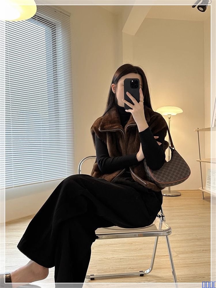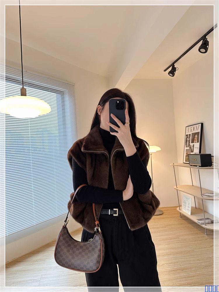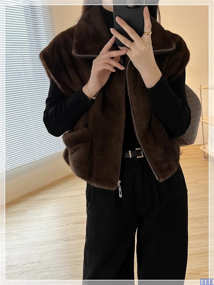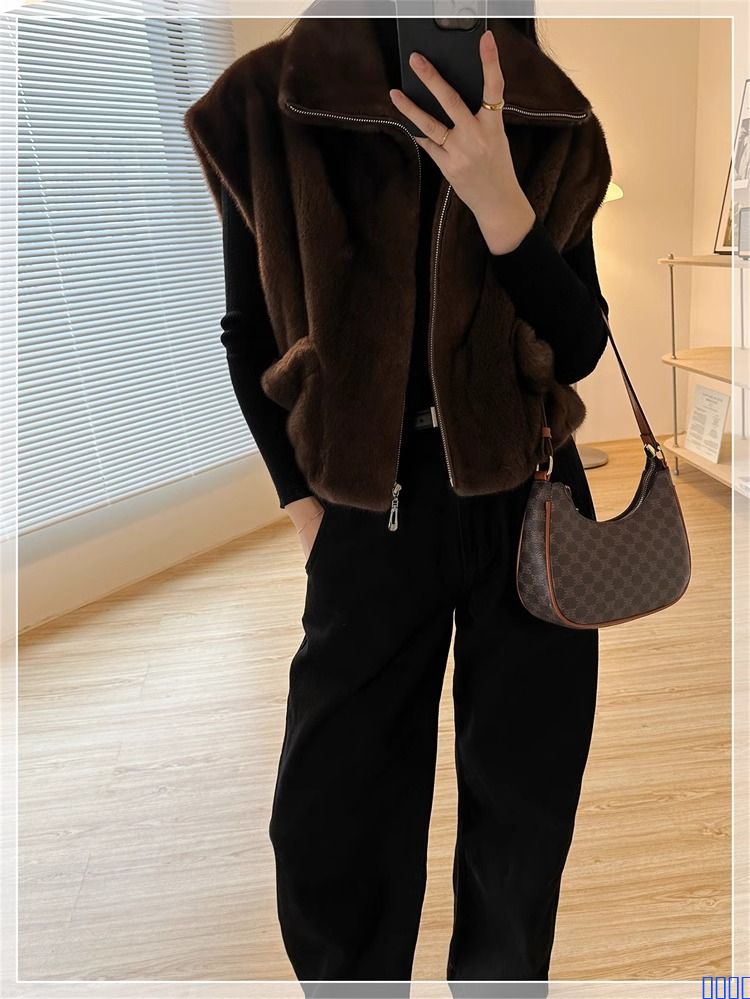 新款进口水貂毛皮草天鹅绒咖啡貂整貂休闲年轻貂皮背心马甲外套女