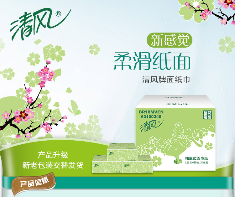 清风(APP)抽纸 柔韧2层200抽软抽*20包纸巾(新老包装交替发货)(整箱售卖)